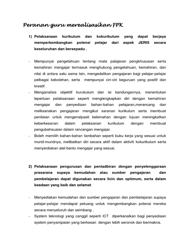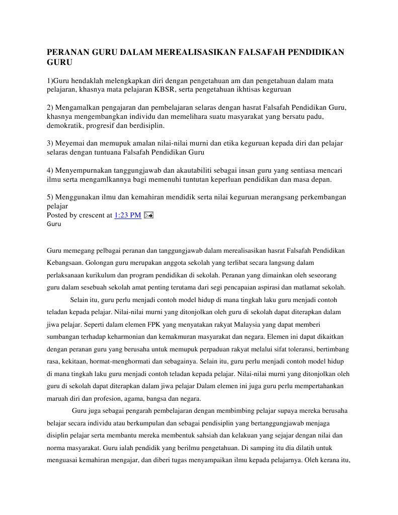 Dengan memperhatikan sifat dan fungsi tersebut, maka guru dapat melakukan tugasnya secara tepat sesuai dengan apa yang harus dilakukan berdasarkan situasi dan kondisi atau karakteristik peserta didik. Ini merupakan tugasan dalam subjek kpf 3012: Falsafah dan dasar yang diberikan oleh pensyarah. 34 kesimpulan peranan guru amat penting dalam menyahut cabaran yang terkandung di dalam fpk. Peranan guru dalam merealisasikan falsafah pendidikan kebangsaan.